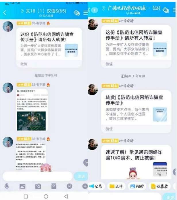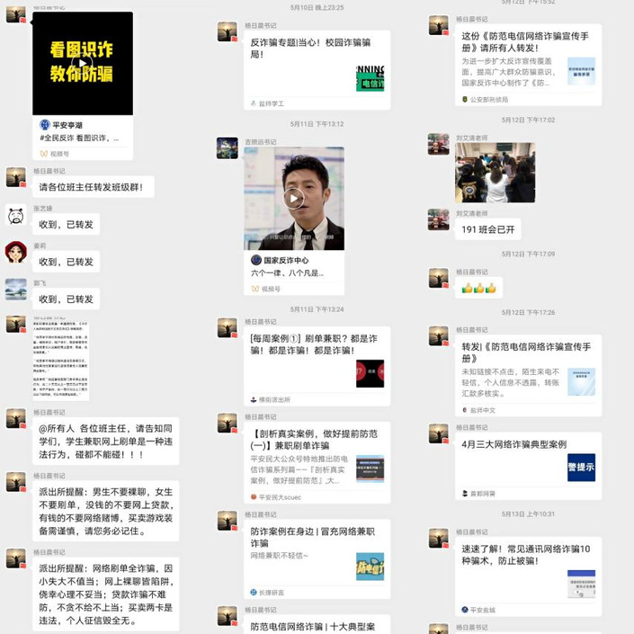EVO真人视讯在班主任、员工干部QQ群、微信群内每天转发有关防范电信网络诈骗的信息,为员工构建起防诈骗安全防护网络,覆盖率达到100%。还通过“盐师中文”微信公众号、微博等新媒体,创作转载具有警示意义、教育作用的作品与资讯普,从国家政策宣传、典型案例分享、诈骗手法解析等多个角度向广大同学普及相关知识,进一步强化全体员工反诈意识,为零诈骗校园努力。