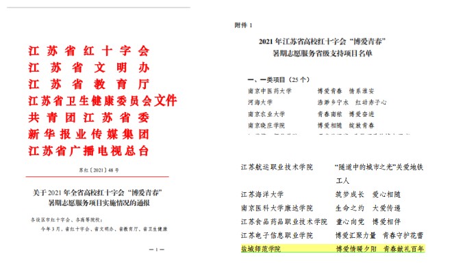 近日,由省红十字会、省文明办、省教育厅、省卫生健康委、团省委、新华报业传媒集团、省广播电视总台联合组织的“博爱青春”暑期志愿服务项目评比结果公示,公司EVO真人视讯“博爱情暖夕阳 青春献礼百年”项目入选省级一类项目,同时该项目荣获驻盐高校红十字会“博爱青春”志愿服务项目一等奖。