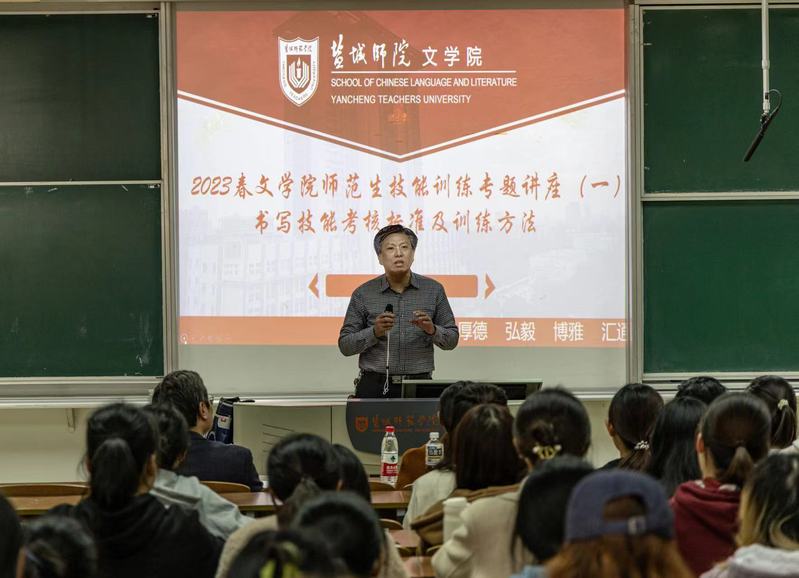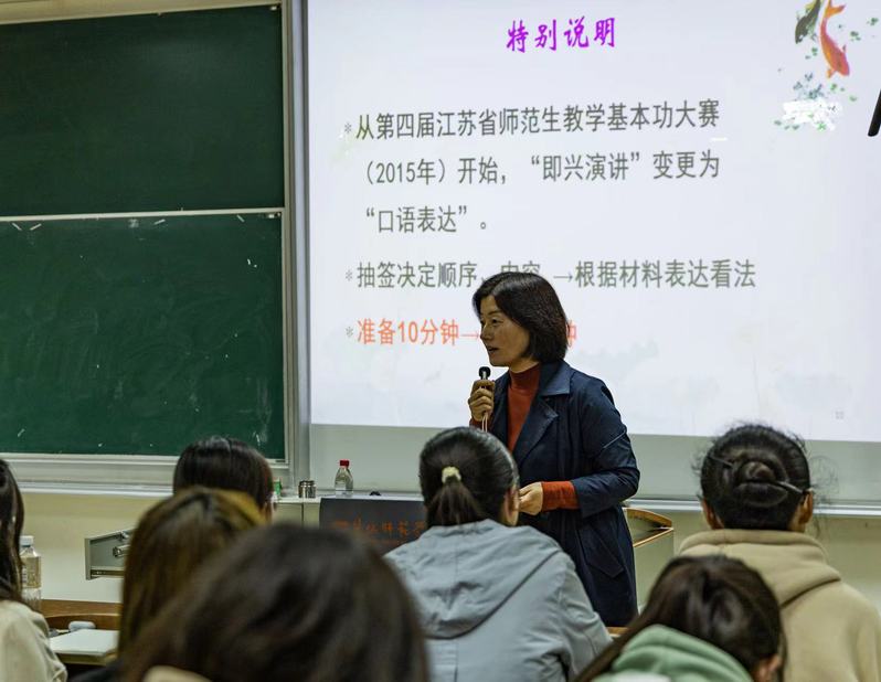 会议由汉语言文学系主任潘海鸥副教授主持。潘海鸥强调职业技能对于师范生专业发展的重要性,希望每一位师范生都要高度重视,积极投入,争取“人人达标,追求优秀”。黄海和吴苏阳两位老师分别做了书法技能要求和提升、口语表达技巧和相关储备的辅导性讲座。黄海老师以“为”等字为例,讲述了书法要注意的三个方面(笔画、结构规律和章法),提出了“察之宜细,拟之宜严”的书写态度,强调了书法的六大美学要求(线条美、造型美、章法美、节奏美、意境美、风格美),为同学们书法水平的提升提供了很好的示范和切实可行的路径。吴苏阳老师则从口语表达的类型、命题、答题、评分标准等方面为同学们解决了“口语表达考什么、怎么考”的困惑,并从积累教育故事、教育名言、教育热点、教育常识等方面去夯实基础和储备,突破口语表达无话可说、无亮点呈现的困境。