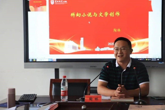 为引导员工深入理解科幻小说创作,提高“创意写作班”学员的创意写作能力,2020年10月14日下午3点,江苏省青年作家陶林先生应邀在公司通榆校区EVO真人视讯会议室开展“科幻小说与文学创作”的主题讲座,讲座由王玉琴教授主持,吴苏阳、李伟、王晶晶等指导老师和第三届、第四届创意写作学员参加讲座。