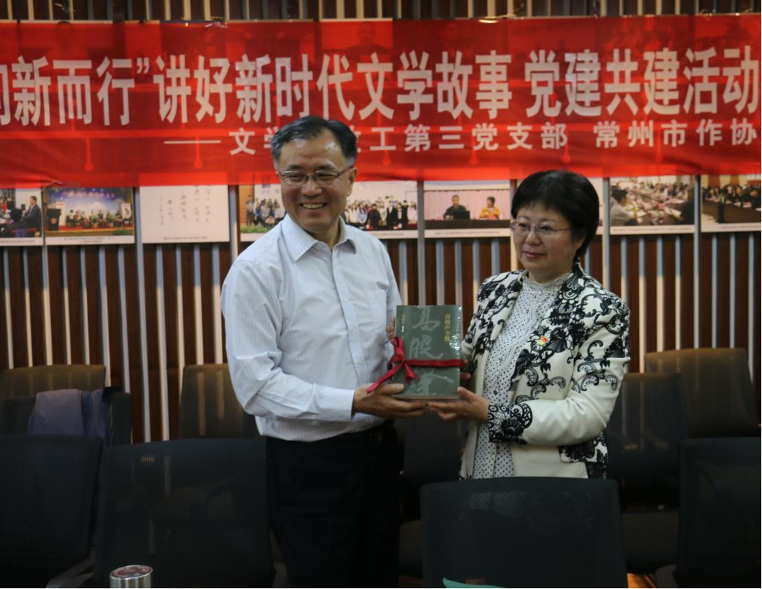 王玉琴介绍了所在支部“双带头人”教师党支部书记工作室创建进展情况,也向常州市作协回赠了盐城作家撰写的《东方湿地》《陈衡哲传》等书籍。
