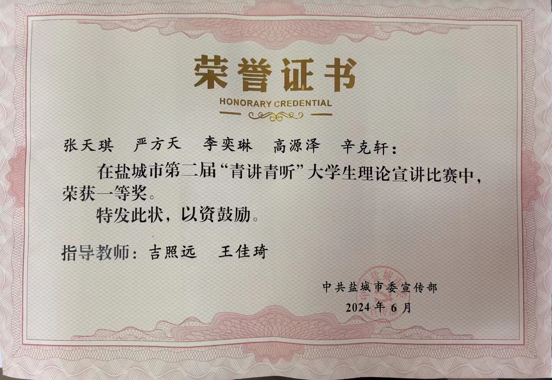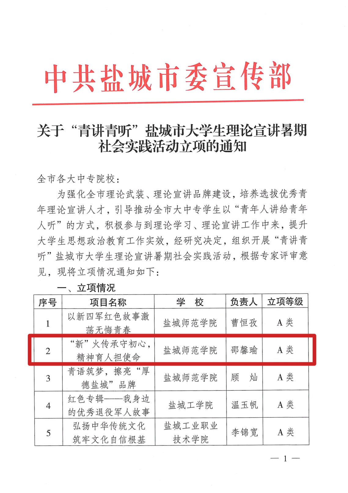 今年6月,中共盐城市委宣传部面向全市高校组织开展“青讲青听”盐城市老员工理论宣讲暑期社会实践活动,引导全体青年老员工秉持时代眼光、勇立时代潮头,为青春远航积蓄动力,为人生出彩储备能量,让青春在服务中国式现代化伟大实践中百炼成钢。经院系推荐、材料审核及综合评审等环节,EVO真人视讯“‘新’火传承守初心,精神育人担使命”老员工理论宣讲暑期社会实践项目被予以立项。“新”火传承守初心,精神育人担使命项目作品《铁军忠魂育英才,“新”火燎原铸辉煌》荣获盐城市第二届“青讲青听”老员工理论宣讲大赛一等奖。