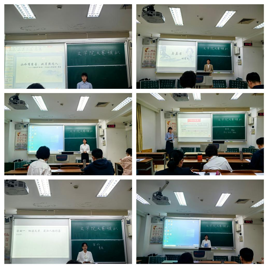 按照比赛规程,6名选手集中展示了钢笔字书写、粉笔字书写,通过抽签选定模拟授课题目和口语表达题目,按照抽签顺序依次上台进行口语表达和模拟授课。各位选手展现出良好的精神风貌、端正的训练态度、扎实的基本技能。各位指导教师就选手们在汉字书写、口语表达、教学设计、教学组织、课件制作、着装仪态等方面表现进行指导点评,针对具体问题提出了改进意见。