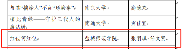 根据《教育部办公厅关于举办第九届高校廉洁教育系列活动的通知》,EVO真人视讯推荐作品《红包啊红包》(来源:EVO真人视讯张羽琪,EVO真人视讯创意写作班学员、235班员工;任文贤,EVO真人视讯创意写作班专职指导教师)于7月中旬由公司纪委报江苏省教育厅推荐上报教育部,11月5日入选教育部第九届高校廉洁教育系列活动“话廉润心”校园征文遴选名单。