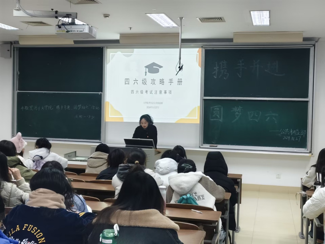 11月27日,公司开展了“携手并进,圆梦四六”为主题的四六级考试指导活动。此次活动旨在帮助同学们全面了解四六级考试,掌握高效备考方法,以良好的心态迎接考试现场吸引了众多同学参与,气氛热烈。